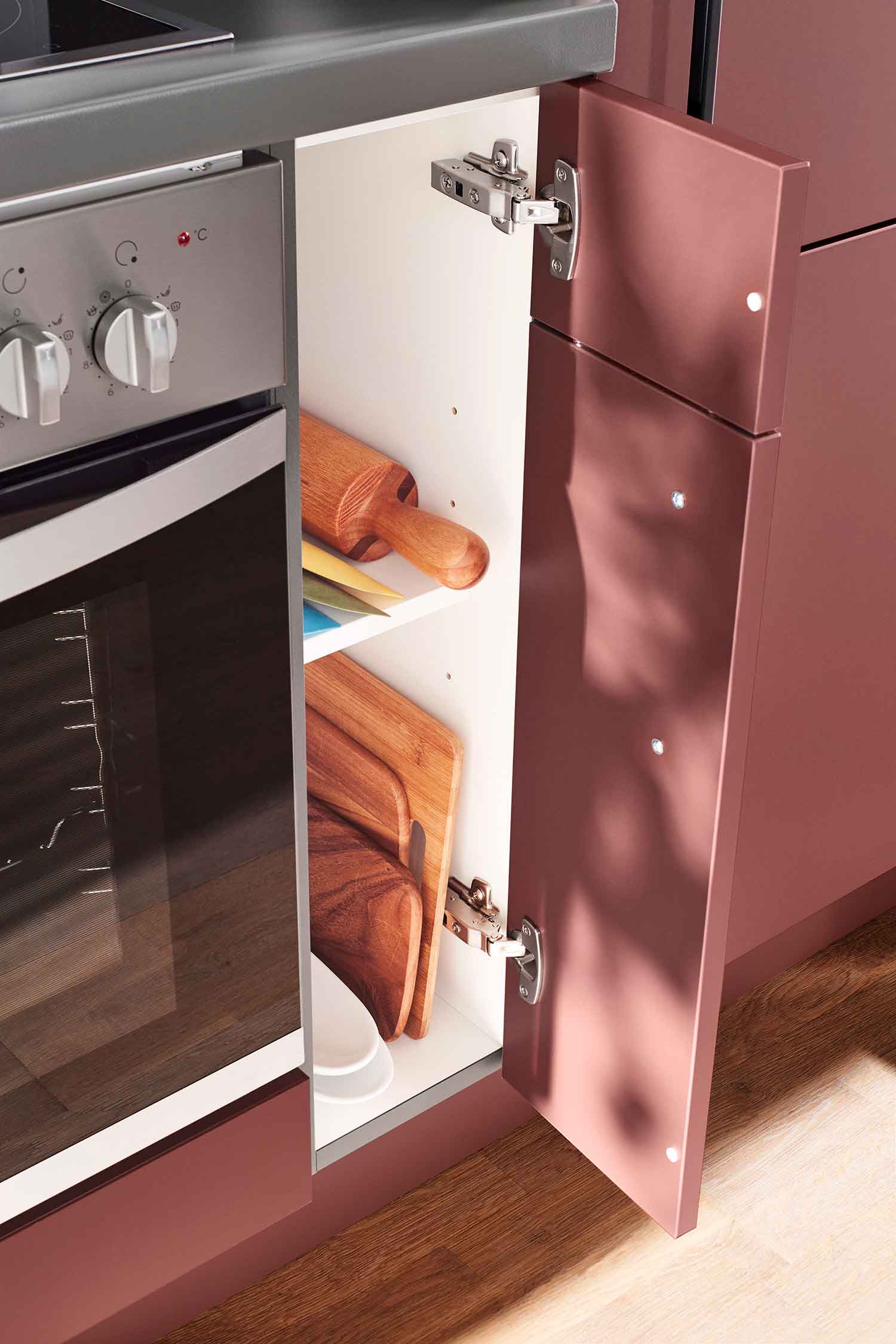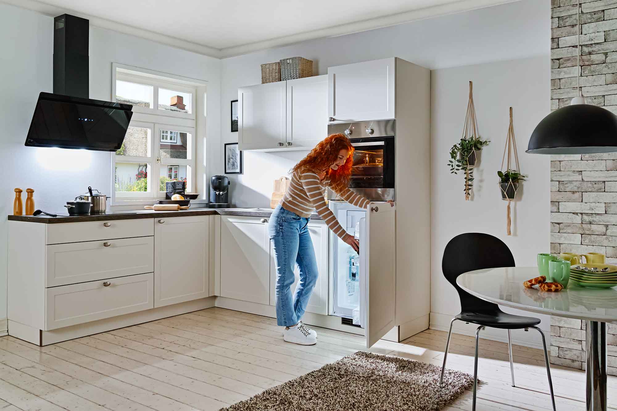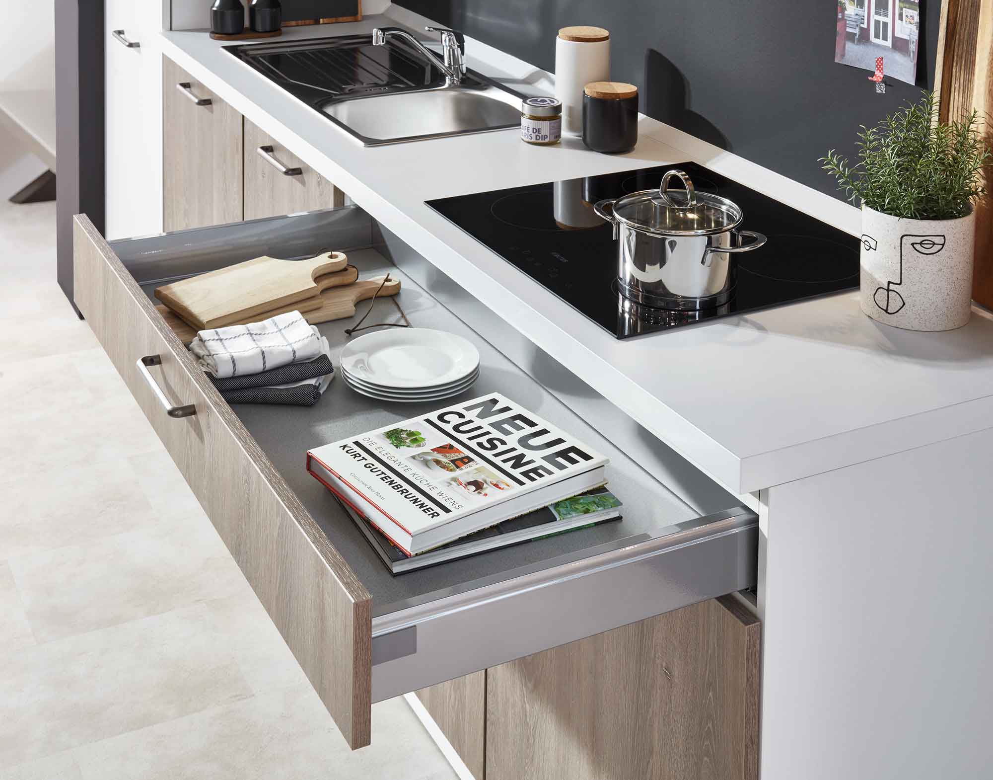 zum Beispiel ausziehbare oder klappbare Tische und Arbeitsflächen, schaffen bei Bedarf zusätzliche Fläche und verschwinden danach platzsparend. Kompakte Geräte wie schmale Geschirrspüler oder Backofen-Mikrowellen-Kombinationen sind ideale Platzsparer für Miniküchen.