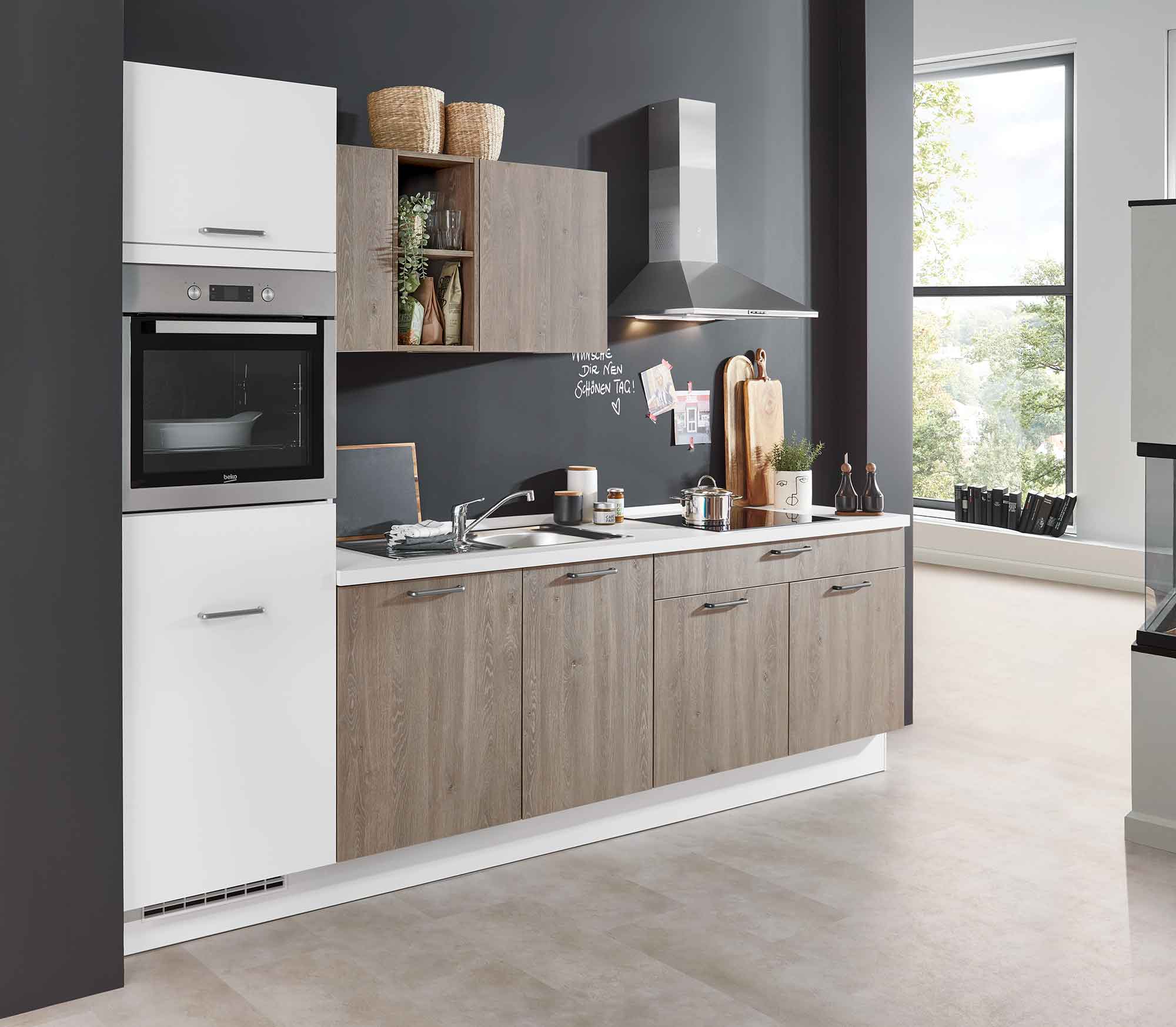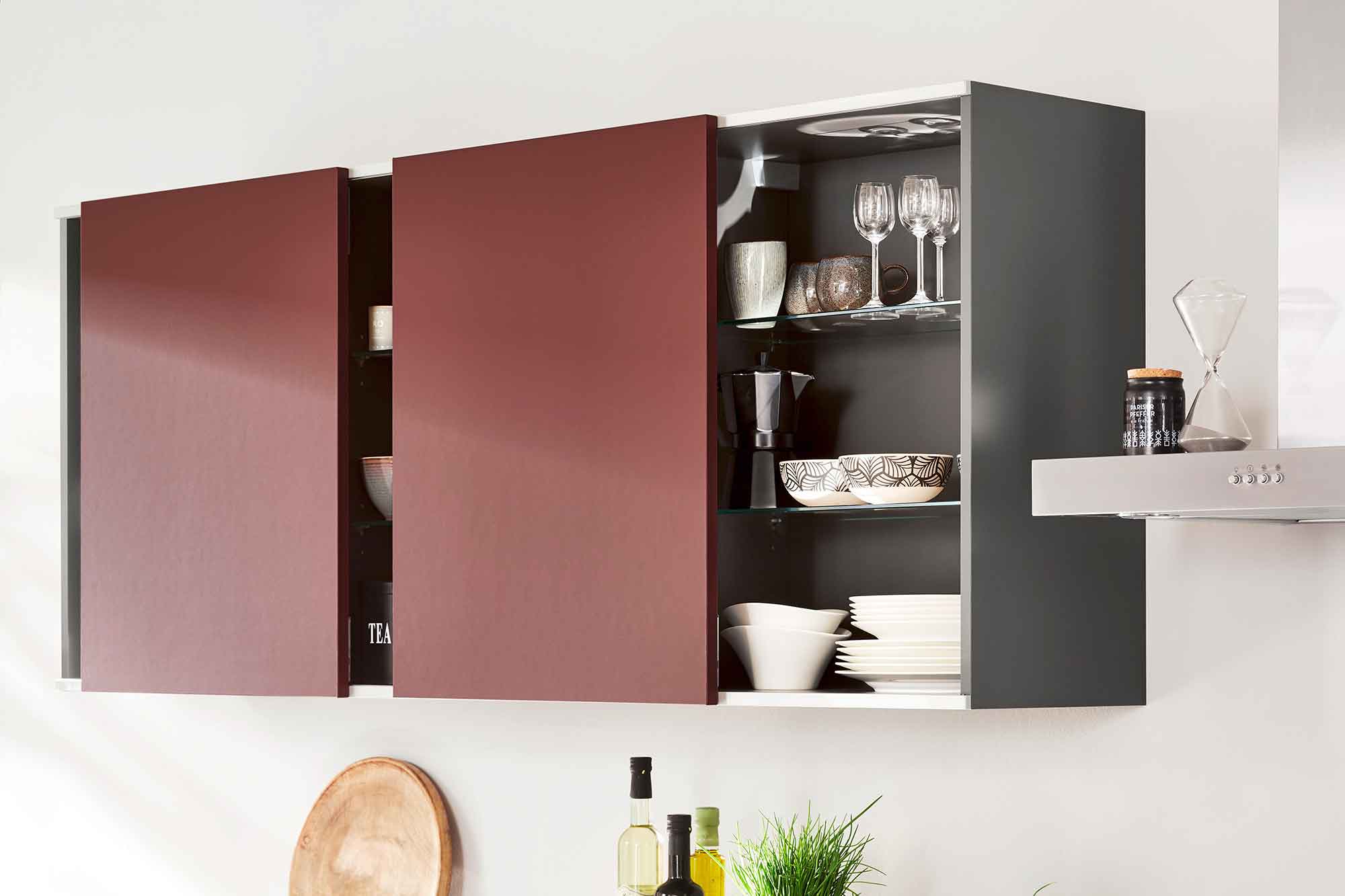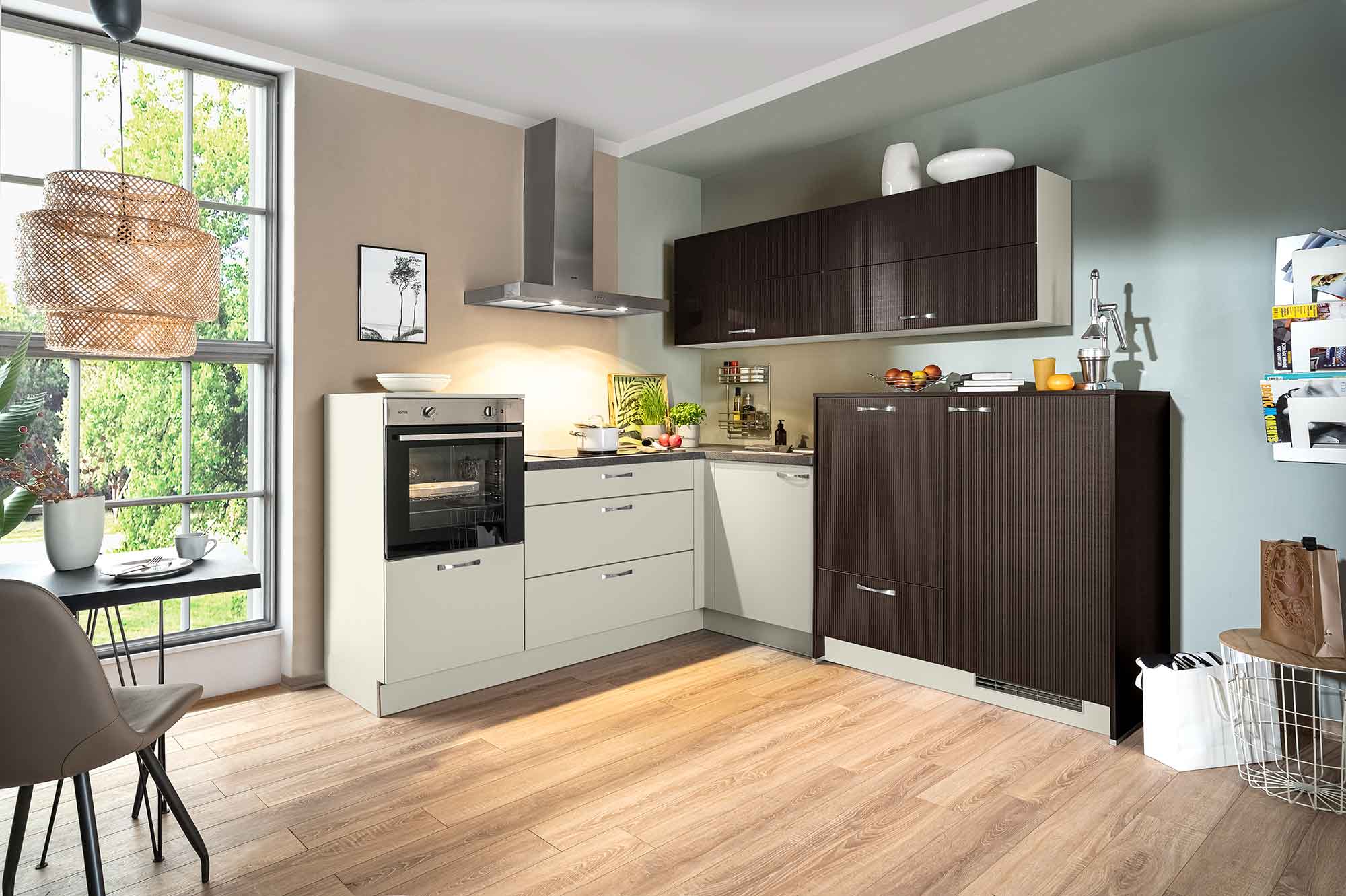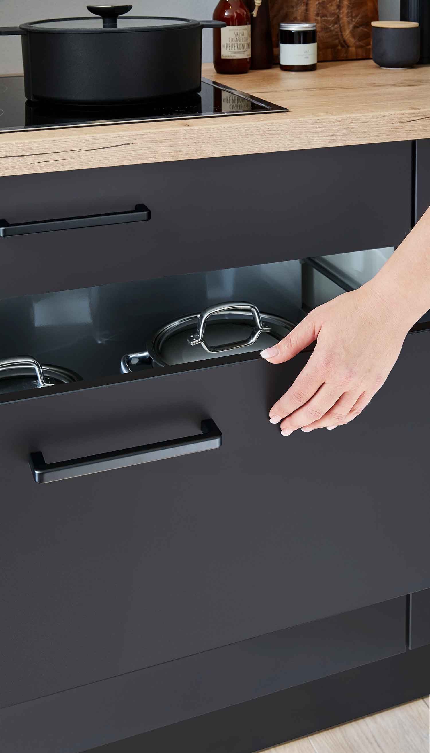 zum Beispiel ausziehbare oder klappbare Tische und Arbeitsflächen, schaffen bei Bedarf zusätzliche Fläche und verschwinden danach platzsparend. Kompakte Geräte wie schmale Geschirrspüler oder Backofen-Mikrowellen-Kombinationen sind ideale Platzsparer für Miniküchen.