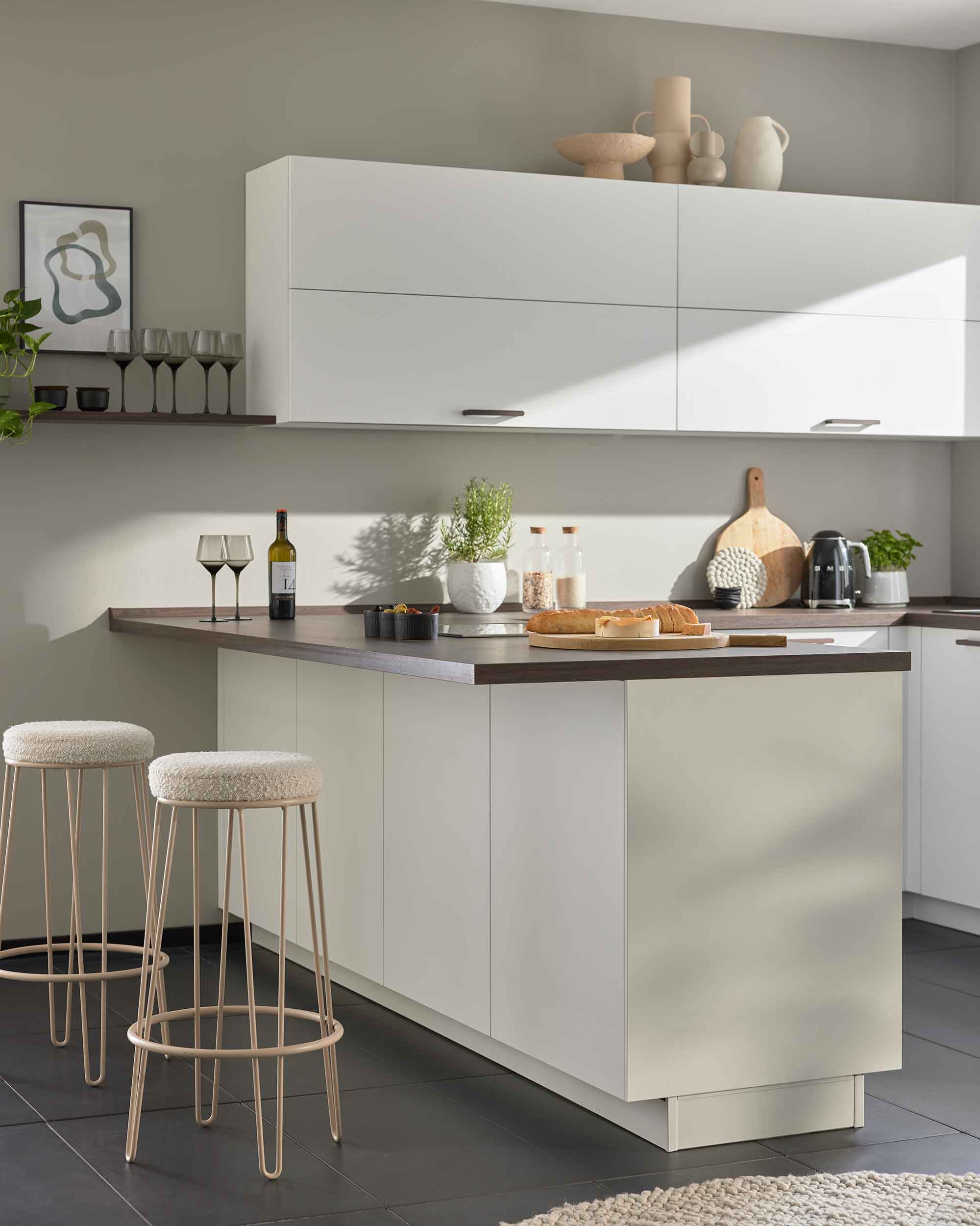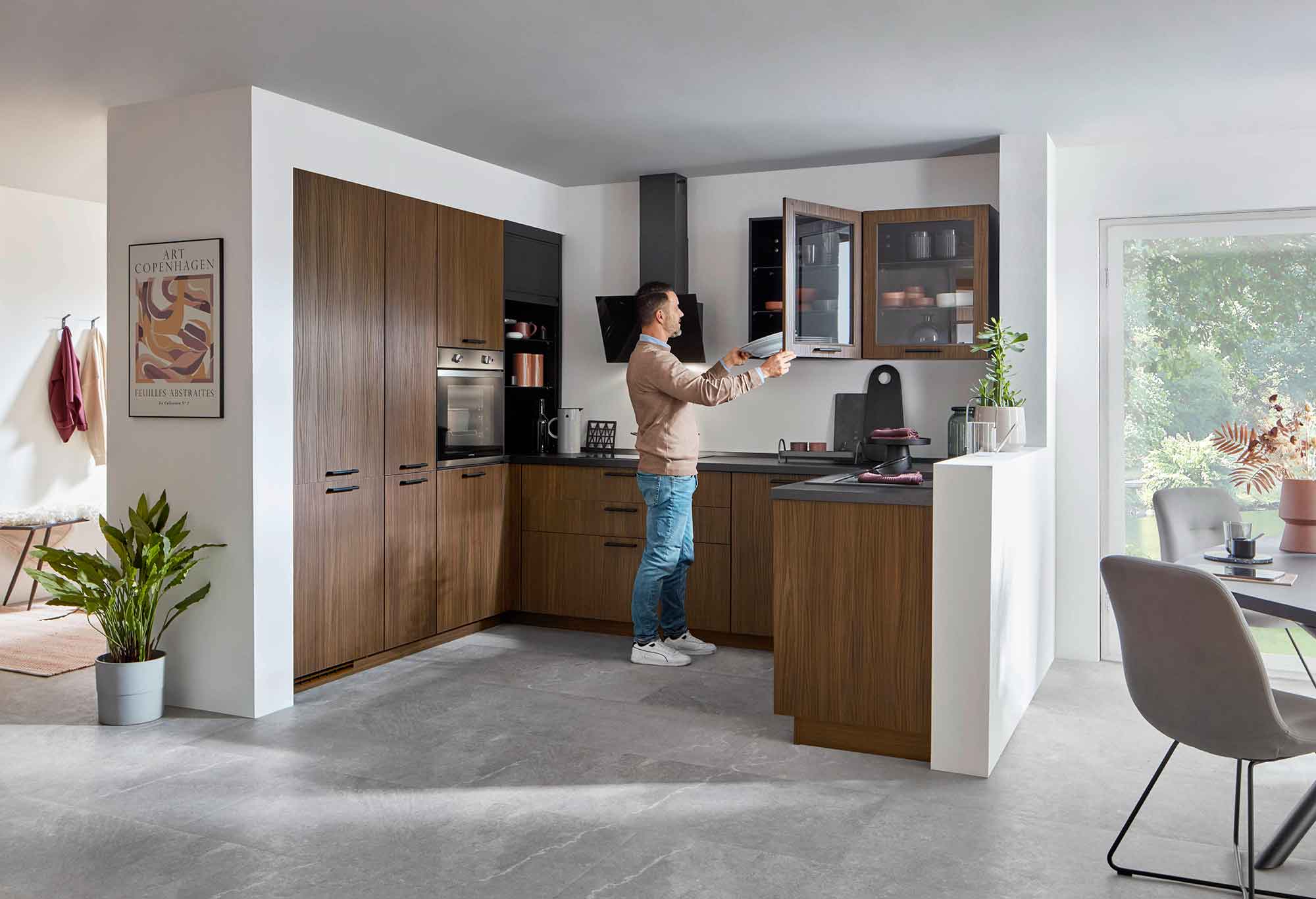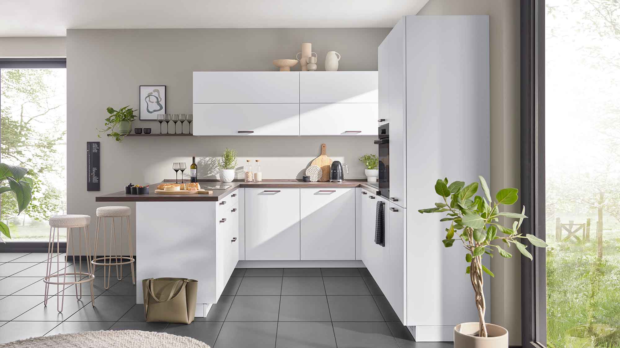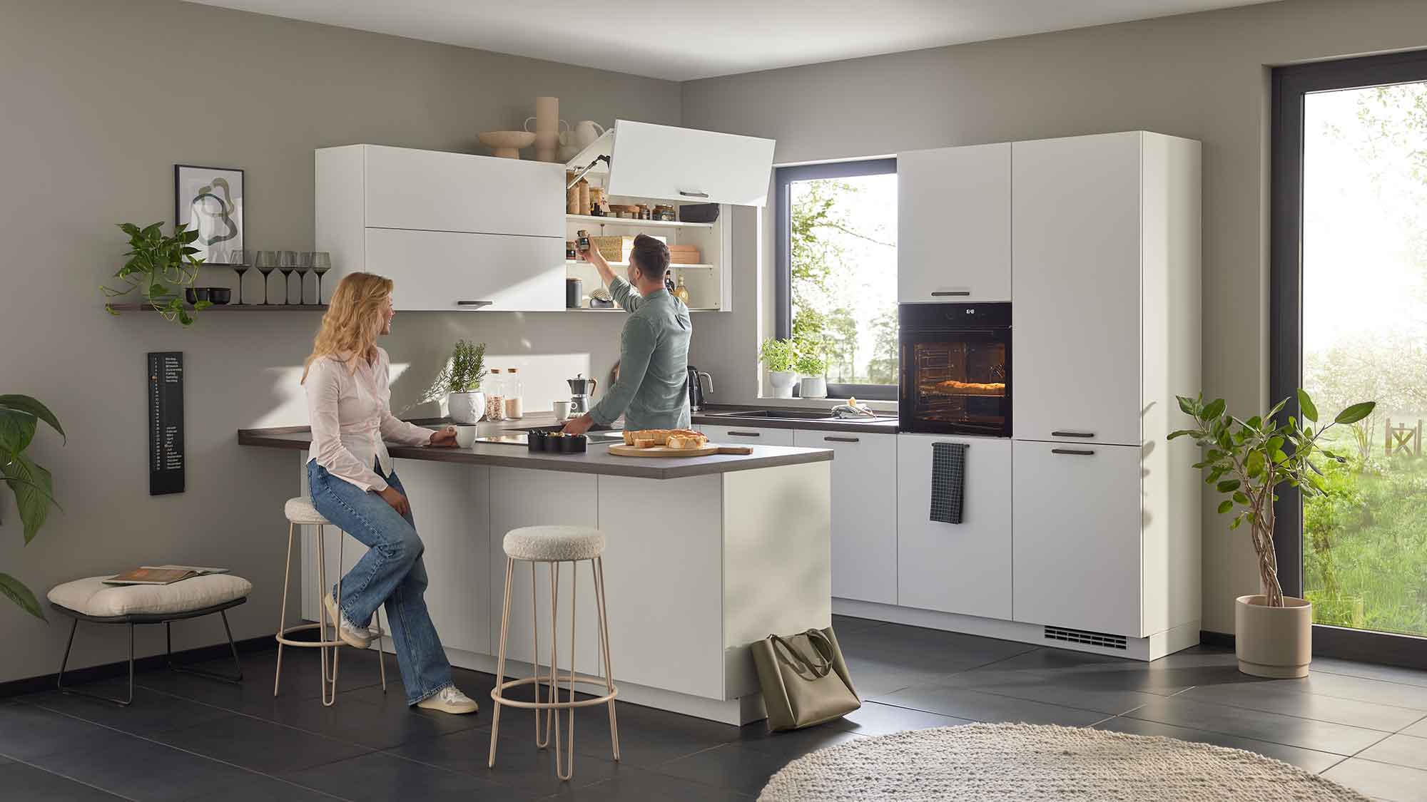Eine U-Küche überzeugt durch ihre großzügigen Stauraum- und Arbeitsflächen, die durch die dreiseitige Anordnung optimal genutzt werden können. Das klassische Arbeitsdreieck aus Herd, Spüle und Kühlschrank lässt sich hier besonders effizient umsetzen, was kurze Wege und flüssige Arbeitsabläufe ermöglicht. Gleichzeitig grenzt die U-Form den Kochbereich optisch klar vom Wohnbereich ab und schafft so ein gemütliches Raumgefühl. Auf Wunsch kann eine Seite zudem als Theke oder Frühstücksbar gestaltet werden, was die U-Küche zu einem multifunktionalen Zentrum für Kochen, Essen und Kommunikation macht.